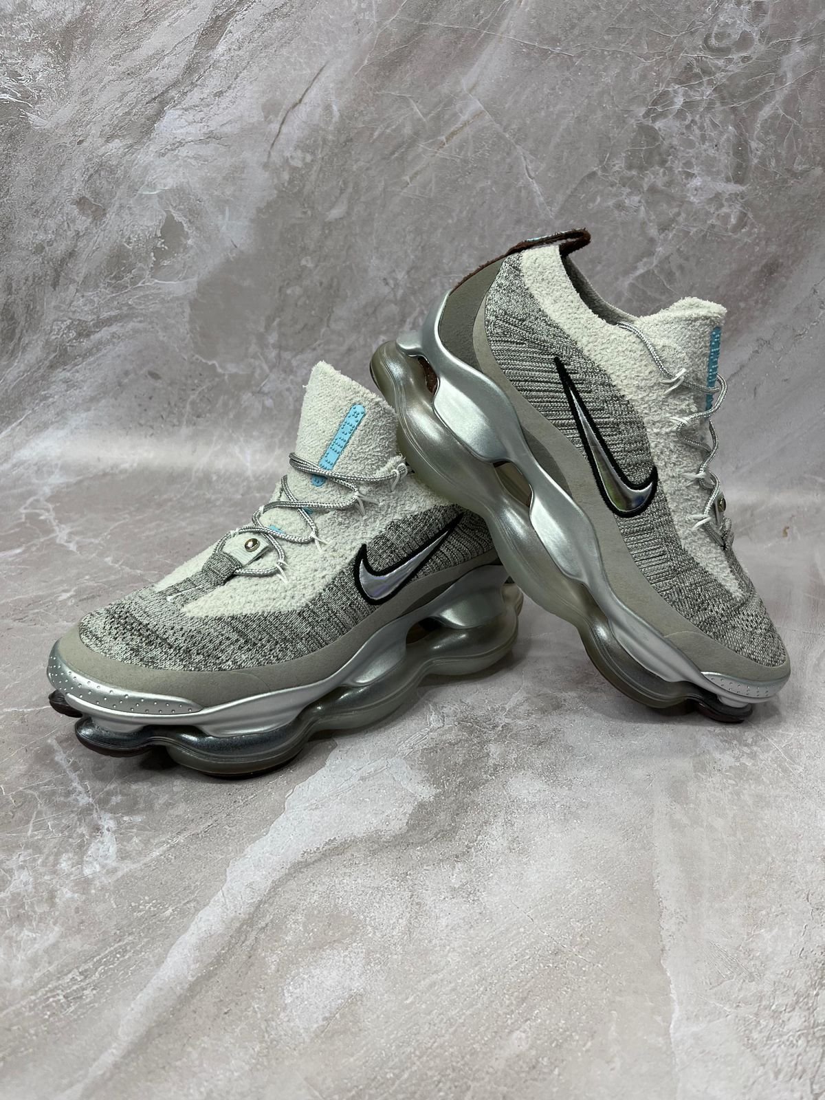 Parte superior predominantemente de tejido Flyknit ligero, combinado con paneles de tejido tipo chenilla o malla que aportan textura.