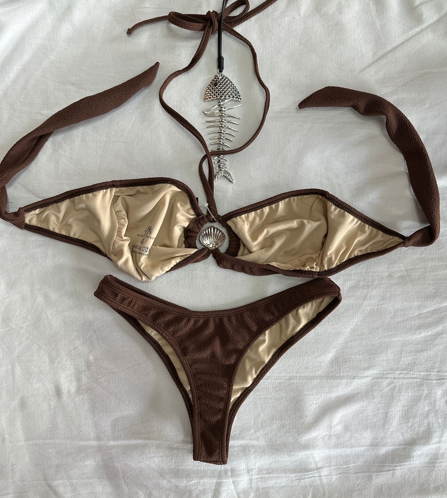 Bikini dos piezas en tono marrón chocolate, con un diseño sofisticado y detalles que marcan la diferencia. El top estilo bandeau fruncido aporta un calce favorecedor y se ajusta con tiras al cuello, destacándose por su dije metálico de espina de pez, un toque original y moderno. La bombacha tiro medio tipo colaless realza la silueta y brinda comodidad, confeccionada en una tela suave con textura delicada