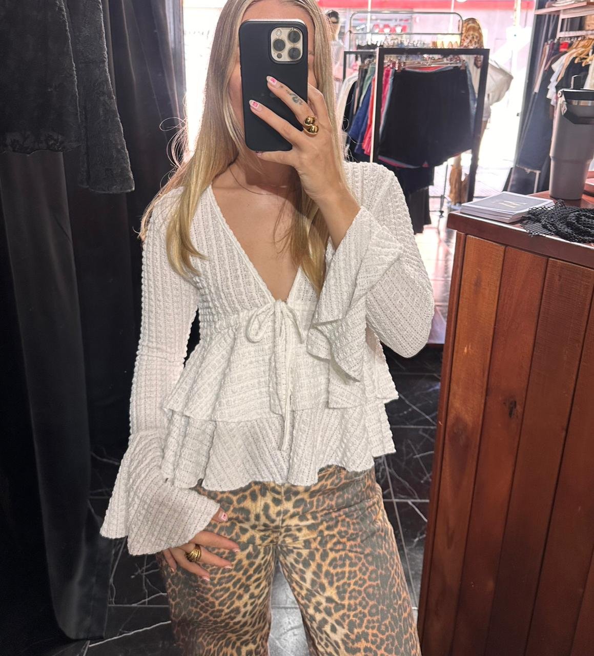 Blusa blanca con textura y diseño boho romántico que destaca por su movimiento y delicadeza. Presenta escote en V con lazo frontal, volados en el torso y mangas flare que aportan un aire femenino y sofisticado. Su calce liviano y cómodo la convierte en una prenda ideal para looks urbanos, salidas o combinaciones casual chic. Perfecta para usar con denim, sastreros o prendas animal print y lograr un outfit protagonista sin esfuerzo.