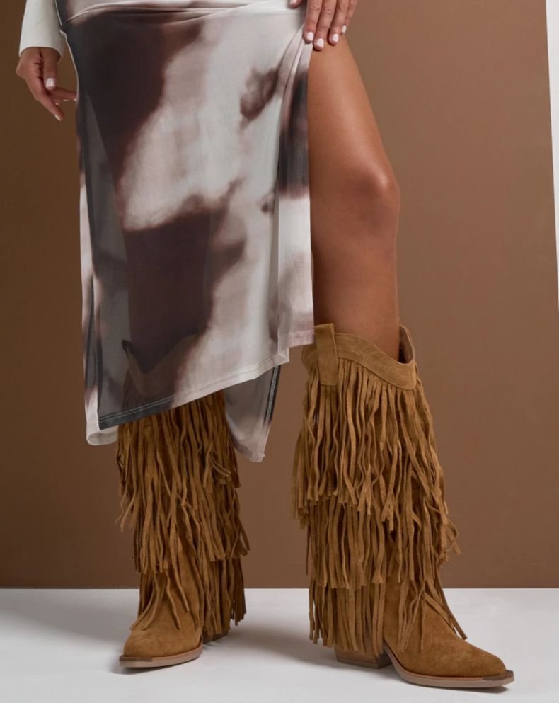 Botas de cuero gamuzado con diseño western y múltiples capas de flecos que aportan movimiento y personalidad en cada paso. De caña alta y base cómoda, son el complemento ideal para looks boho, urbanos o festivaleros, elevando cualquier outfit con un toque protagonista y sofisticado.