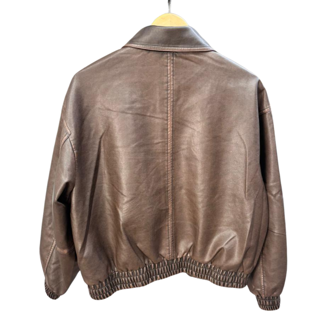Es una chaqueta de estilo casual confeccionada en material tipo cuero de color marrón oscuro con un acabado ligeramente brillante. Tiene un diseño corto y de corte relajado, con cierre frontal de cremallera. Presenta un cuello clásico tipo camisa, lo que le da un aire más versátil y menos deportivo. Las mangas son largas y cuentan con puños elásticos fruncidos, al igual que el dobladillo inferior, que se ajusta al cuerpo aportando un estilo tipo bomber. En la parte frontal incluye dos bolsillos laterales inclinados sin solapa. Las costuras visibles en el pecho y hombros añaden estructura y detalle al diseño. Está colgada en una percha de madera y el material muestra una textura suave con ligeras arrugas naturales.