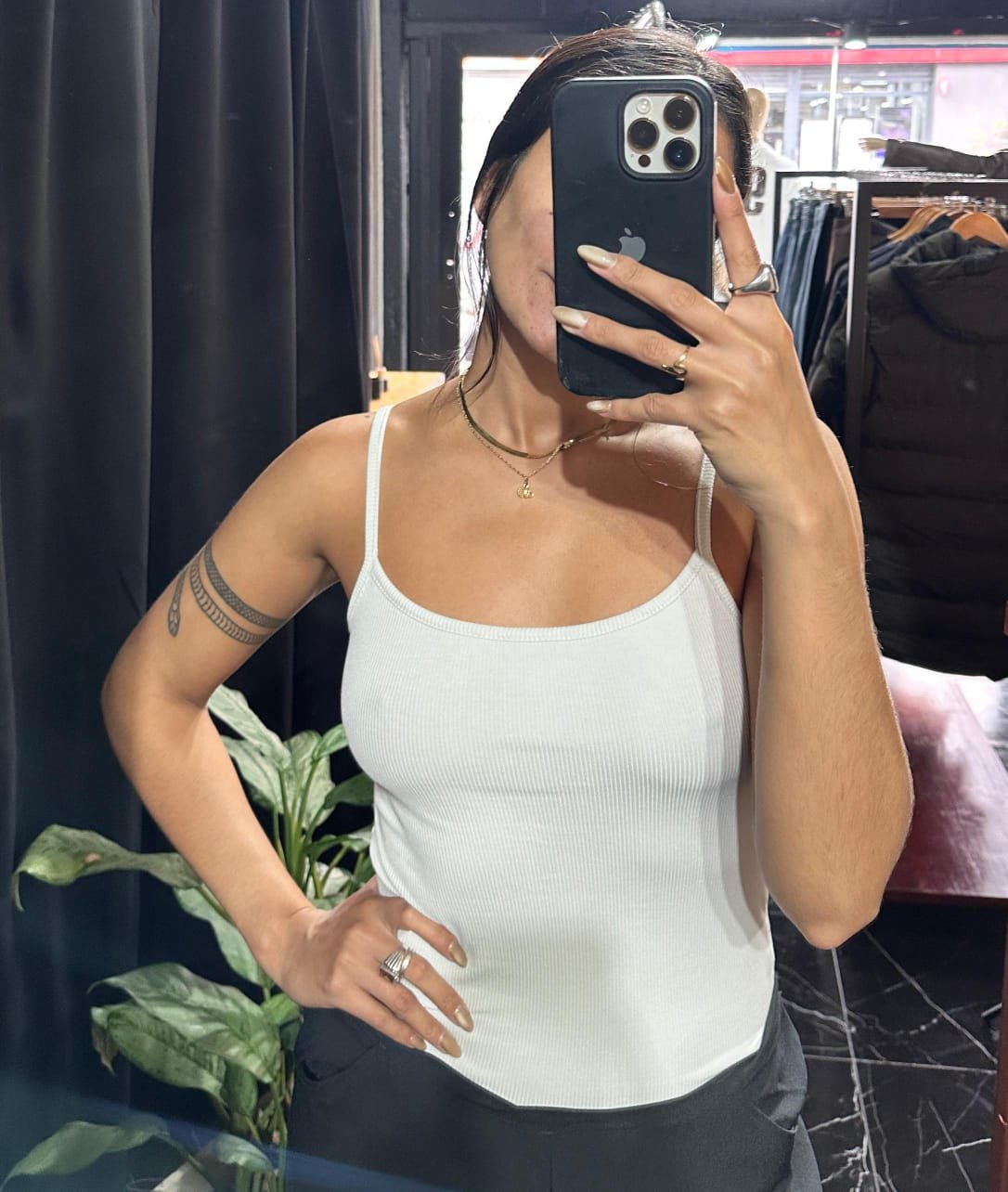 Es un top de tirantes finos confeccionado en tela acanalada de color natural. Tiene un escote recto y limpio, sin detalles de encaje, lo que le da un estilo más sencillo y moderno. Su corte es ajustado y básico, ideal para uso diario, ya sea como prenda principal en clima cálido o como capa debajo de otras prendas.