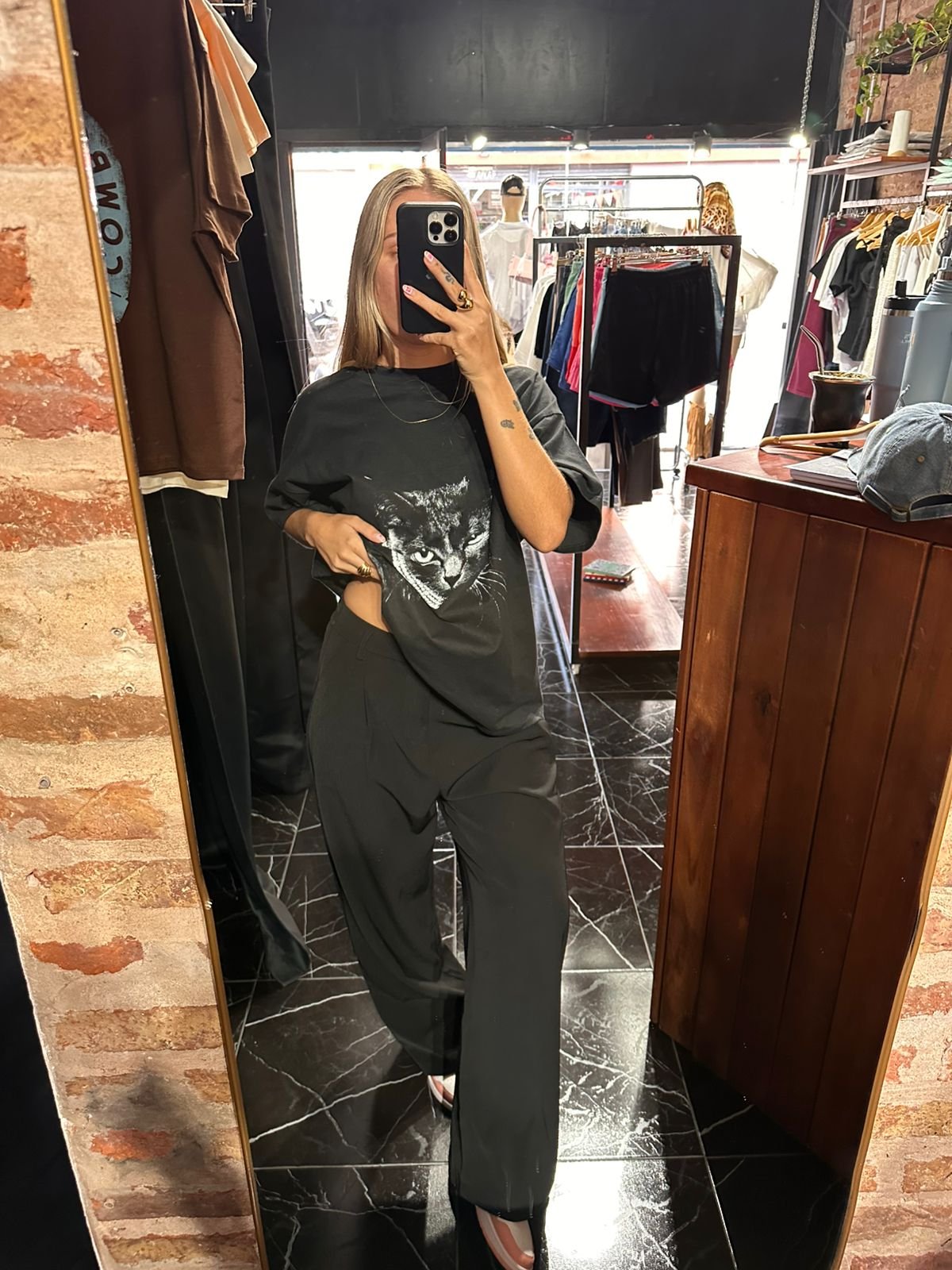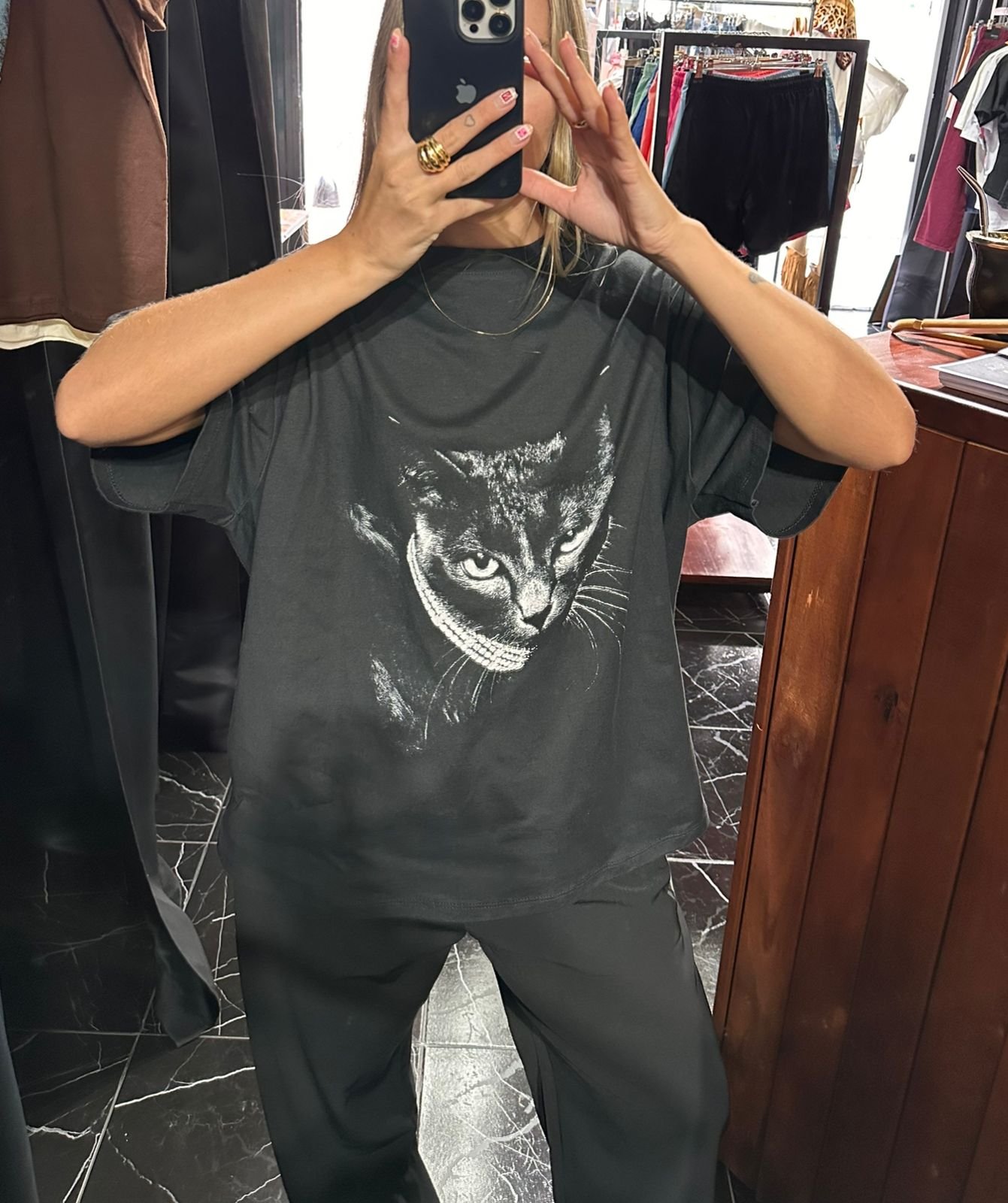 Remera oversize de algodón suave en color negro, con estampa frontal protagonista de gato en efecto monocromo que aporta una estética urbana, misteriosa y moderna. Su calce amplio y relajado brinda comodidad total y un look streetwear que eleva cualquier outfit. Ideal para combinar con jeans baggy, pantalones sastreros oversize o joggers, logrando un estilo versátil que funciona tanto de día como de noche.