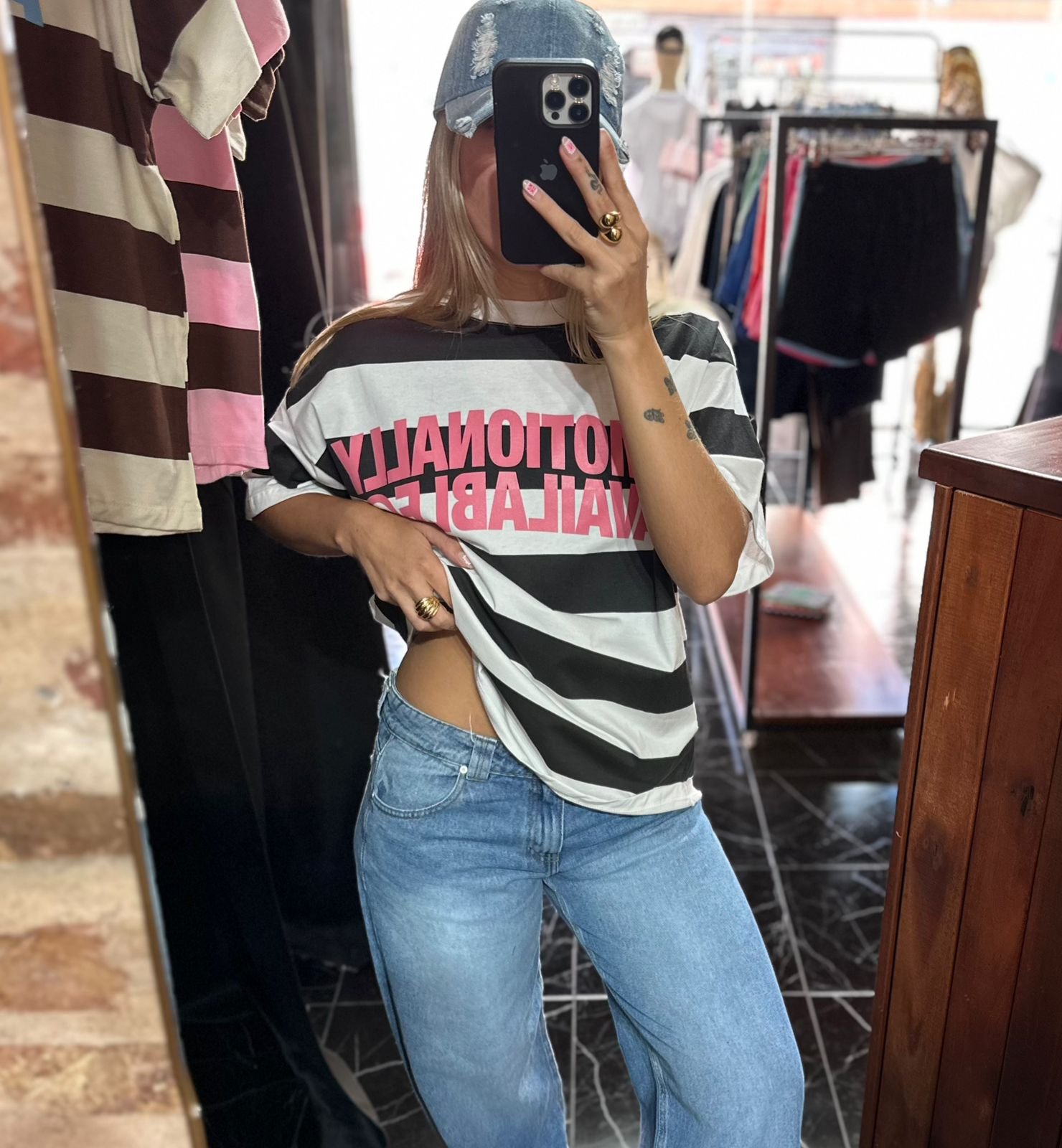 Remera de corte oversize confeccionada en algodón suave y liviano, ideal para un look urbano relajado. Presenta diseño de rayas horizontales en tonos negro y blanco que aportan estilo y versatilidad para combinar en cualquier temporada. Cuenta con cuello redondo reforzado y mangas amplias que brindan comodidad y caída natural. Perfecta para usar con jeans baggy, sastreros o joggers y lograr outfits street con personalidad.