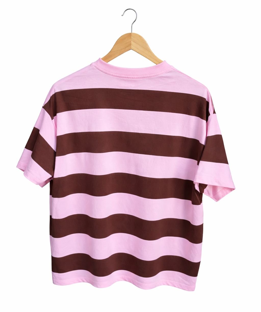 Remera de corte oversize confeccionada en algodón suave y liviano, ideal para un look urbano relajado. Presenta diseño de rayas horizontales en tonos marrón y rosa que aportan estilo y versatilidad para combinar en cualquier temporada. Cuenta con cuello redondo reforzado y mangas amplias que brindan comodidad y caída natural. Perfecta para usar con jeans baggy, sastreros o joggers y lograr outfits street con personalidad.
