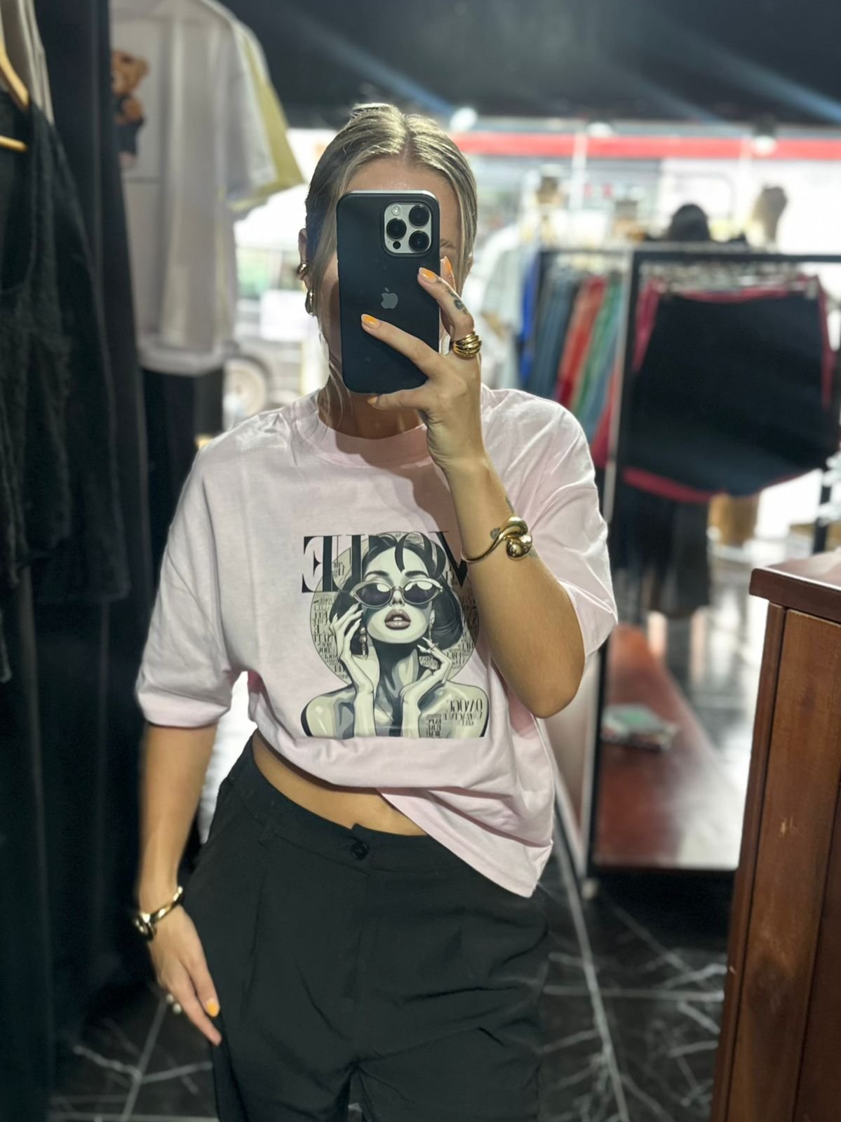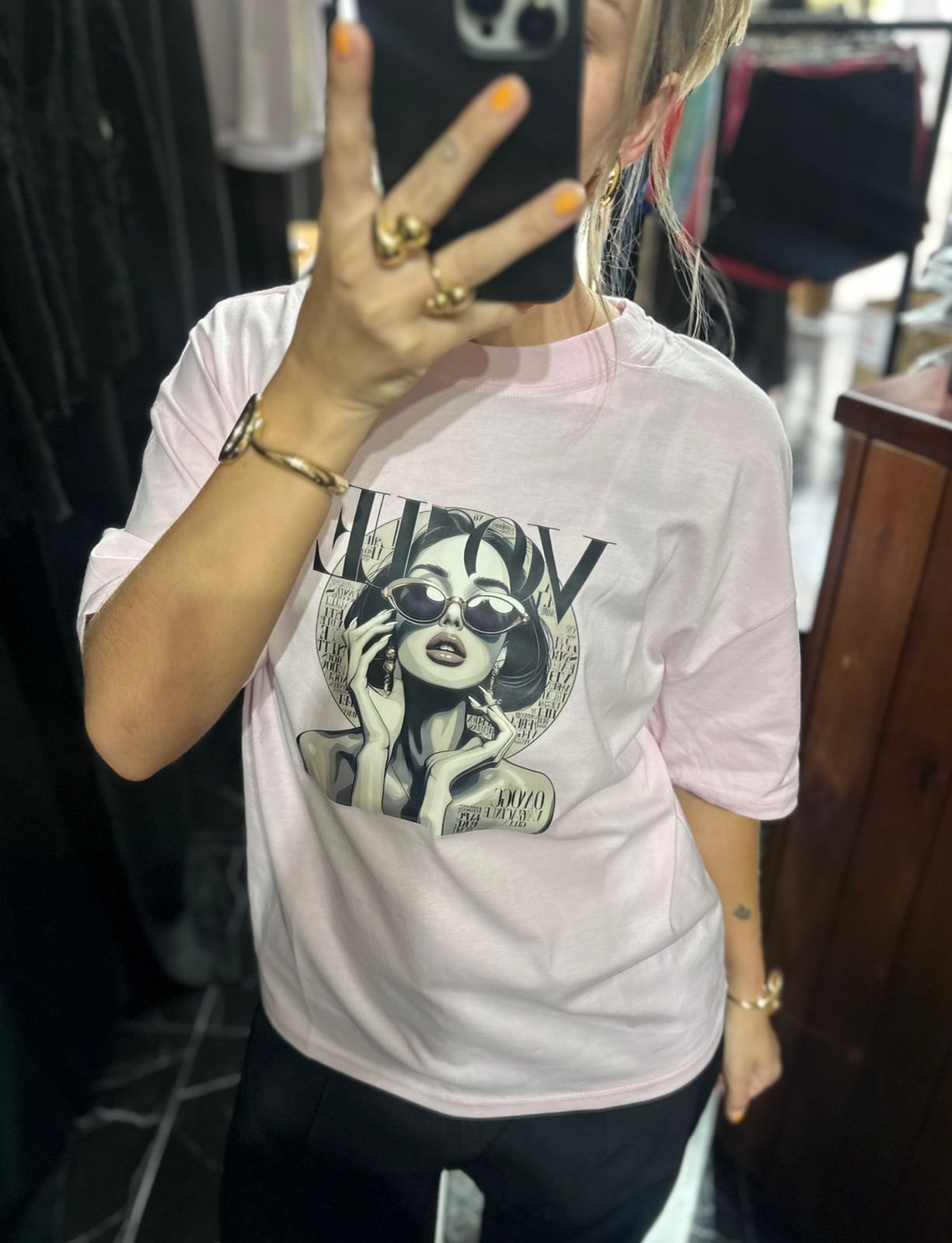 Remera básica rosa pastel con estampa central estilo editorial. Diseño protagonista con ilustración femenina y tipografía VOGUE que le da un aire sofisticado y moderno. De corte cómodo y relajado, ideal para combinar con jeans wide leg, sastreros negros o joggers para un look urbano con toque chic.