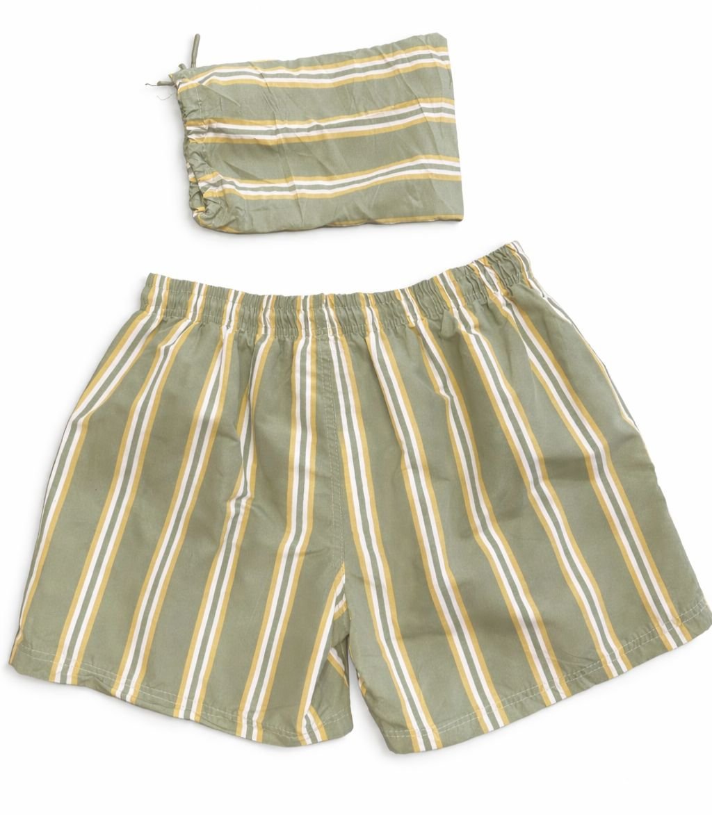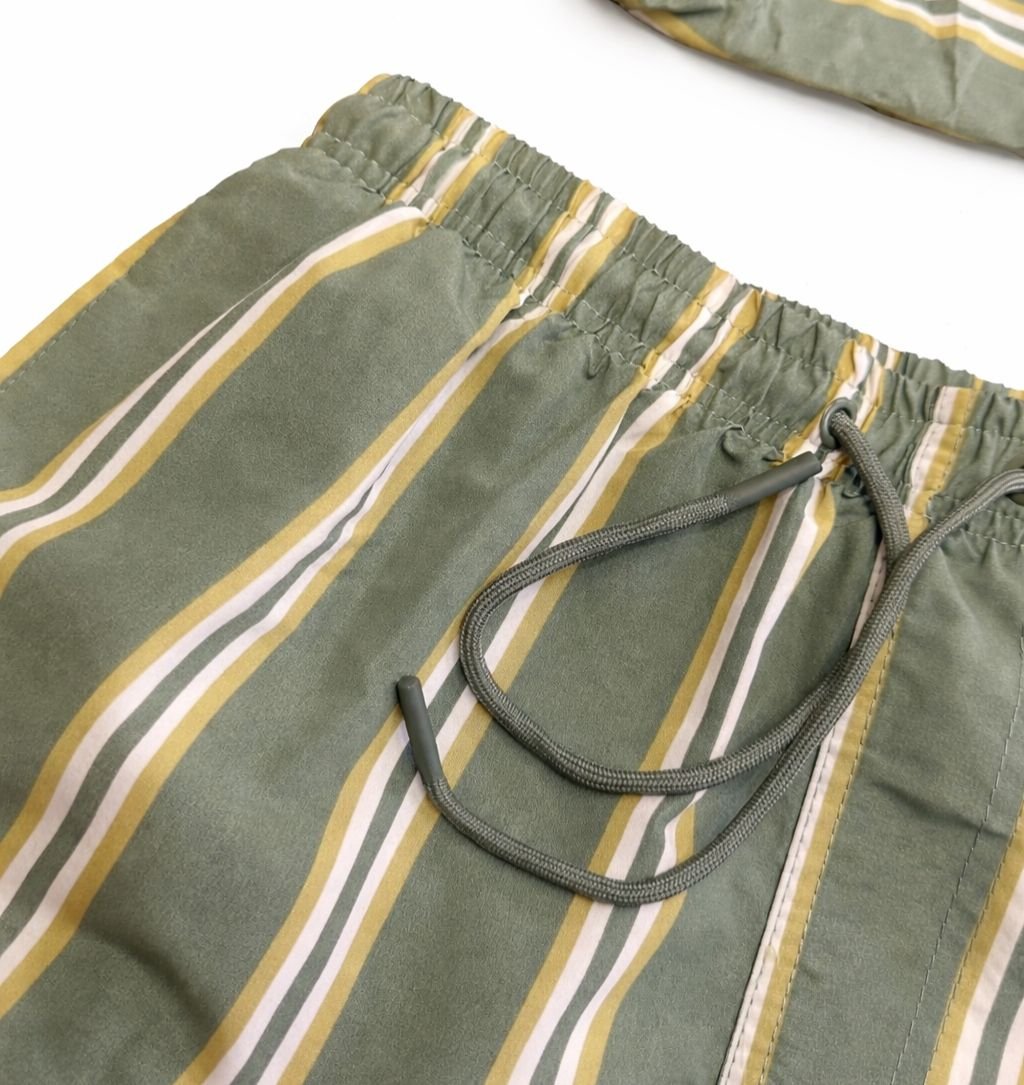 Short de baño con diseño a rayas verticales en tonos verdes, mostaza y blanco, ideal para un look fresco y moderno. Confeccionado en tela liviana y de secado rápido, cuenta con cintura elastizada y cordón regulable para un calce cómodo y seguro. Su estilo versátil lo hace perfecto tanto para la playa o la pileta como para usar en outfits relajados de verano. Un infaltable para quienes buscan comodidad sin perder estilo.