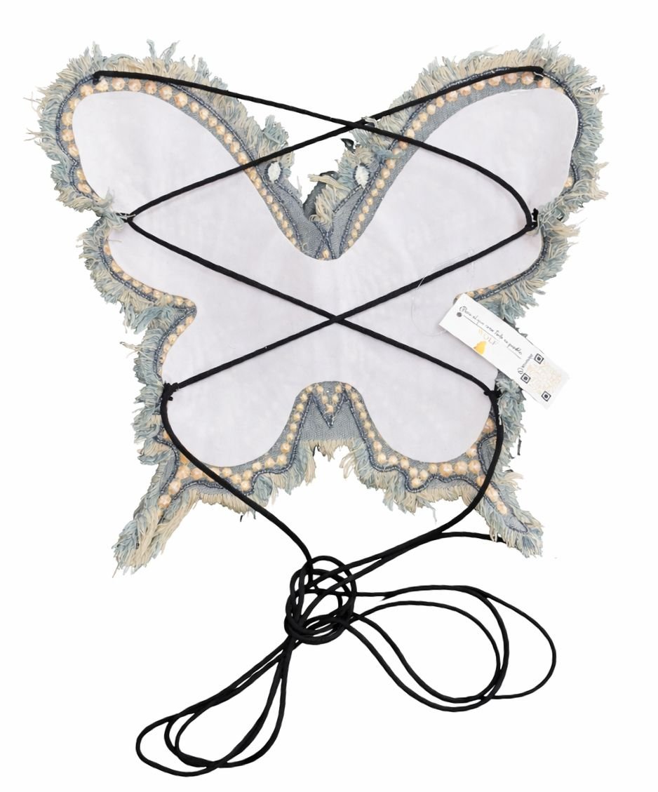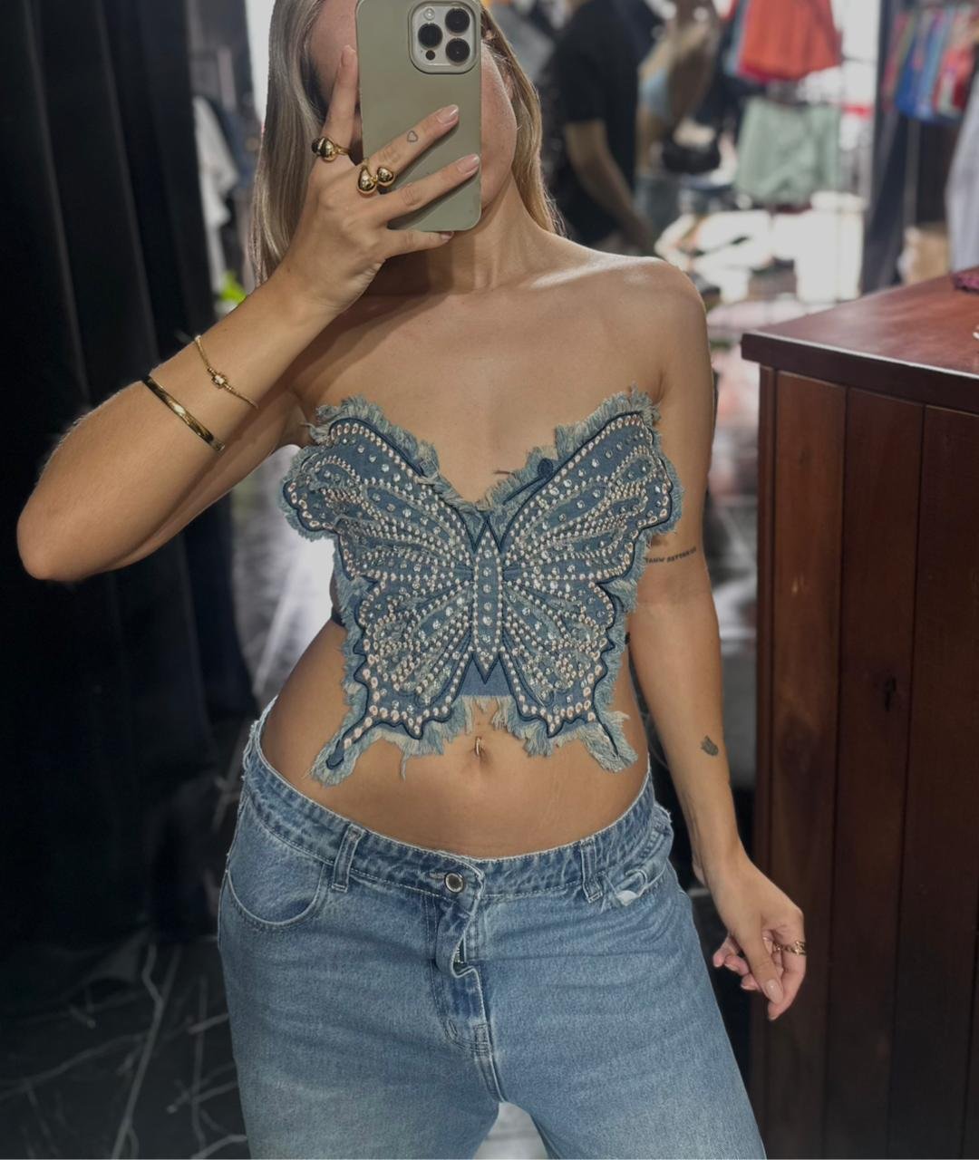 Top con diseño en forma de mariposa, súper original y llamativo. Confeccionado en denim combinado con flecos desflecados y detalles decorativos que le aportan un estilo boho–urbano único. Cuenta con tiras ajustables para atar en la espalda, permitiendo adaptarlo cómodamente al cuerpo y regular el calce. Ideal para looks festivaleros, salidas nocturnas o para elevar un outfit urbano con un toque diferente. Combinalo con jeans tiro alto, pantalones sastreros o mini faldas para un look con actitud.