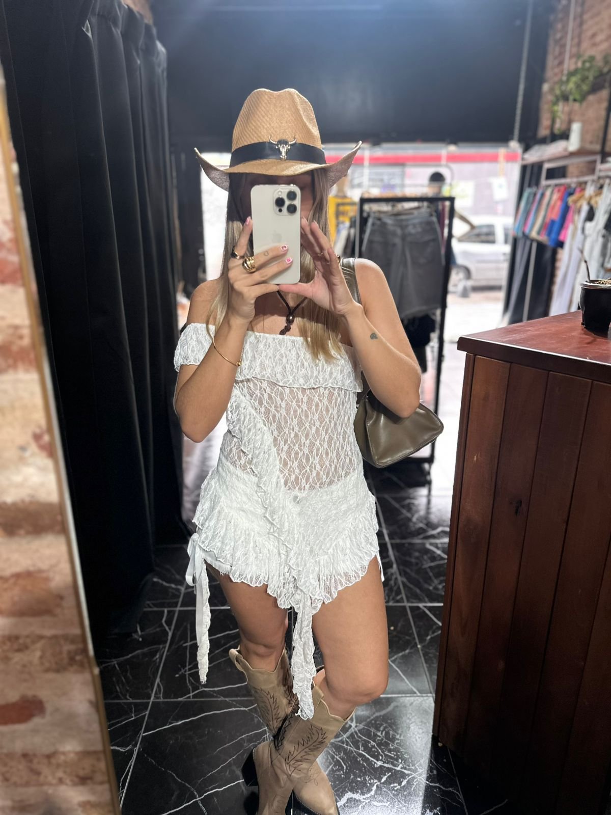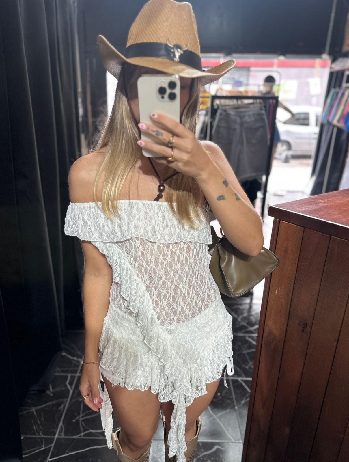 Top de encaje delicado con diseño off shoulder que deja los hombros al descubierto, ideal para lograr un look femenino y relajado. Su tejido liviano y semitransparente aporta un aire romántico y bohemio, mientras que los detalles de volados y la terminación irregular le dan movimiento y personalidad. Perfecto para combinar con shorts, jeans o faldas, tanto para festivales, días de verano o looks casuales con estilo. Una prenda versátil que eleva cualquier outfit boho chic.