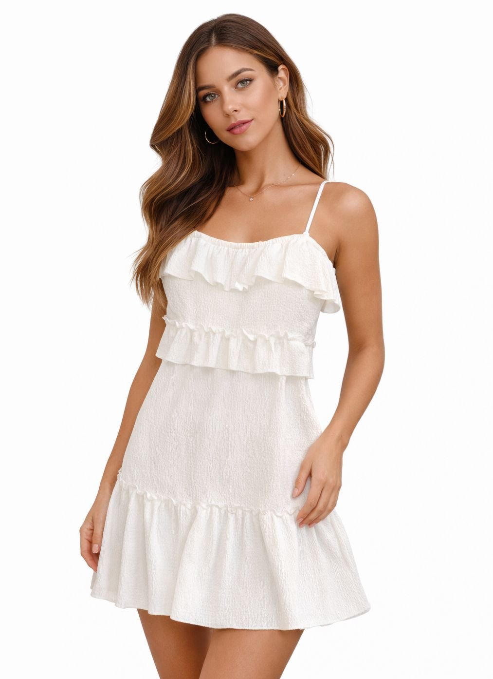 Vestido corto blanco, confeccionado en tela liviana con textura y delicados volados que aportan movimiento y un estilo fresco. Presenta breteles finos y escote recto con detalle de volado frontal, logrando un diseño femenino y relajado. Su corte suelto y falda con terminación en volado brindan comodidad y una silueta natural, ideal para el día a día. Perfecto para looks de verano, salidas casuales, vacaciones o tardes al sol. Combinalo con zapatillas, sandalias o accesorios simples para un outfit canchero y versátil.