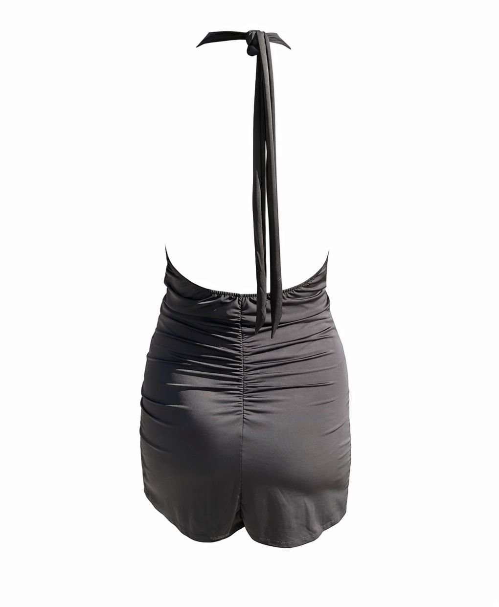 Vestido corto negro, con espalda completamente descubierta y diseño halter que estiliza el cuello y los hombros. Presenta frunce central en la parte trasera que realza la silueta y aporta un efecto visual favorecedor. Su tela suave y con leve brillo acompaña el cuerpo logrando un calce cómodo y sensual. Ideal para salidas nocturnas, eventos o looks protagonistas donde el vestido se lleva todas las miradas. Combinalo con botas, sandalias o tacos para un outfit impactante.