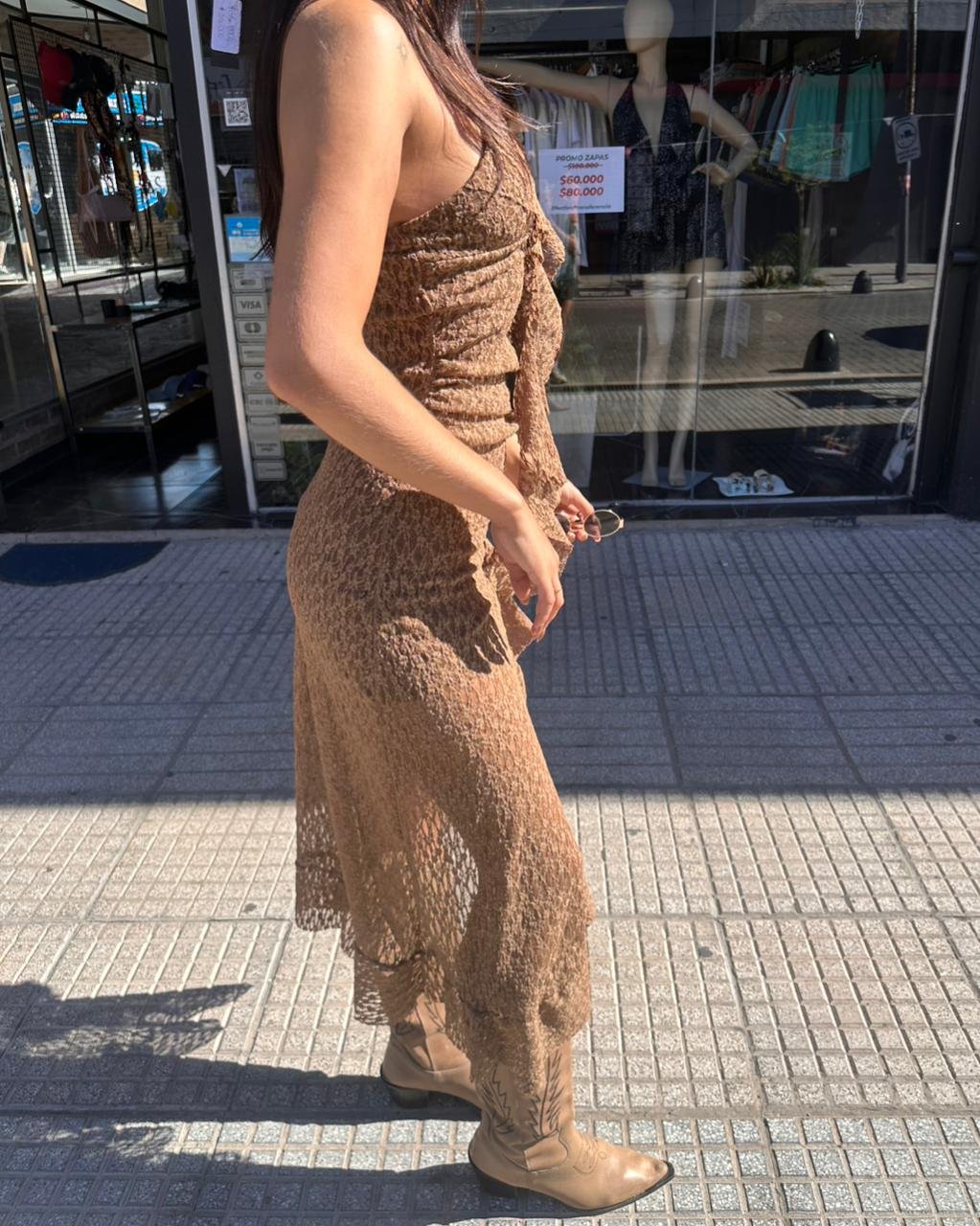 Vestido largo de encaje, con textura delicada y femenina que aporta un look romántico y sofisticado. Presenta breteles finos y escote en V con detalles de volados en encaje que realzan el diseño. Su silueta acompaña el cuerpo con caída suave y terminación con volados asimétricos que aportan movimiento y elegancia. Ideal para ocasiones especiales, eventos, salidas nocturnas o looks boho chic donde buscás una prenda protagonista, liviana y con presencia.